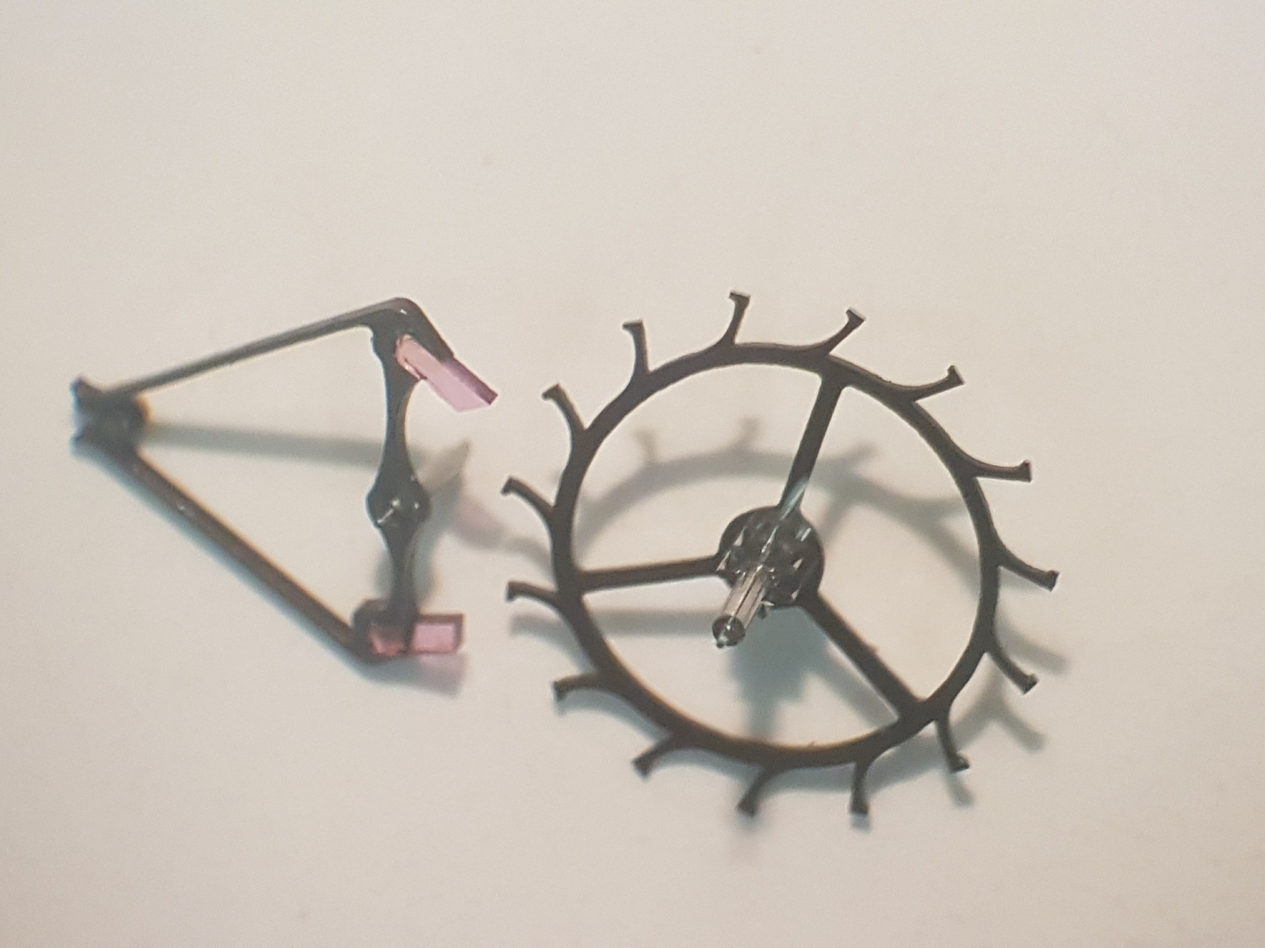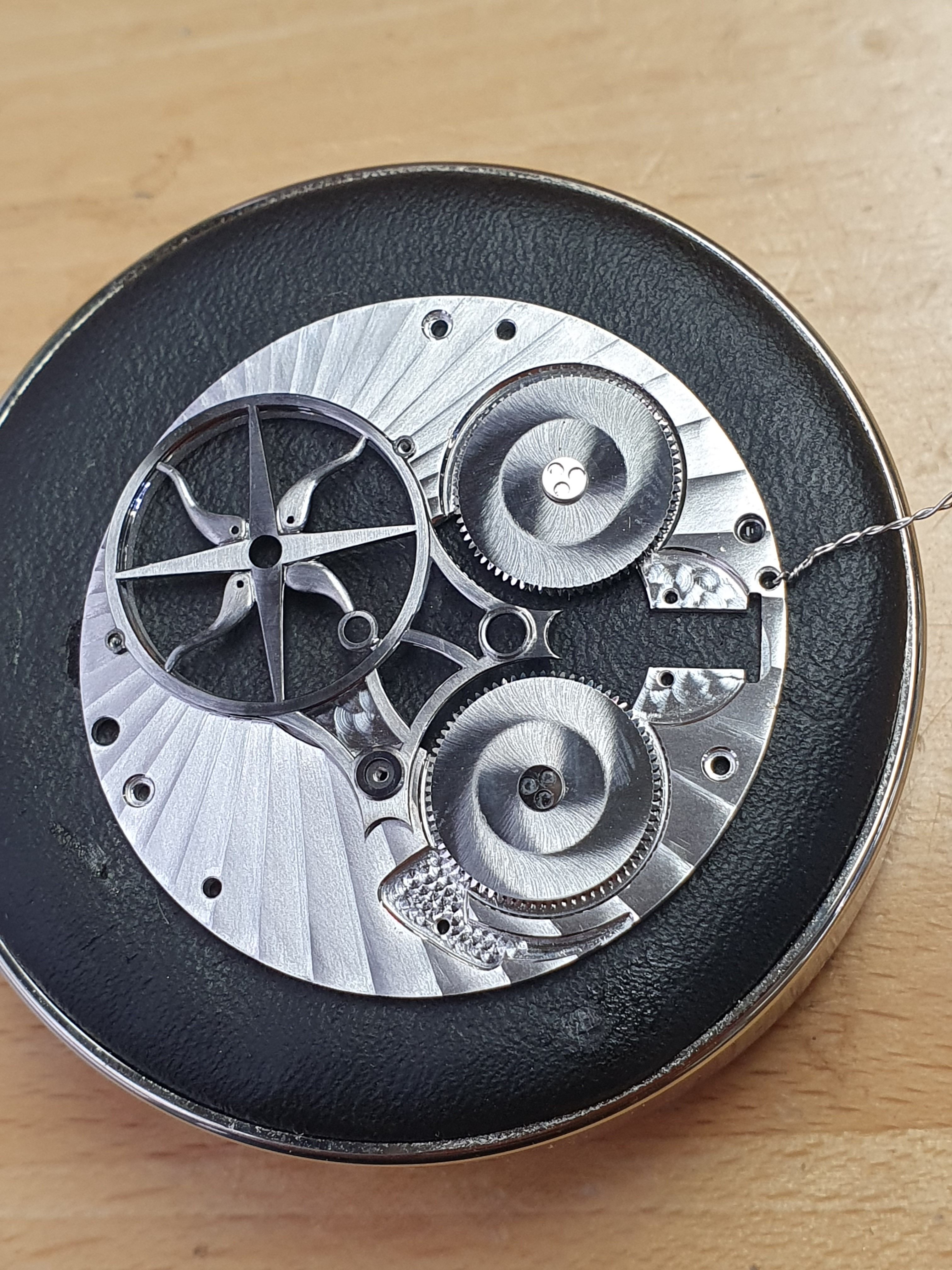 The movement features hand cut and polished rubies in the barrel as well as many other hand cut rubies like the pallets and impulse jewel, 20 jewels in total.