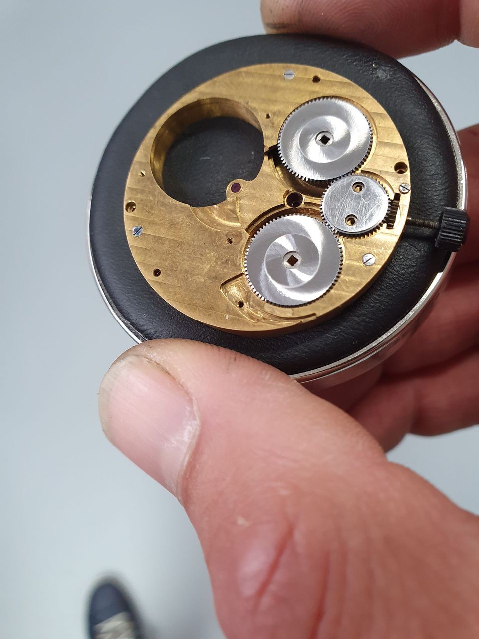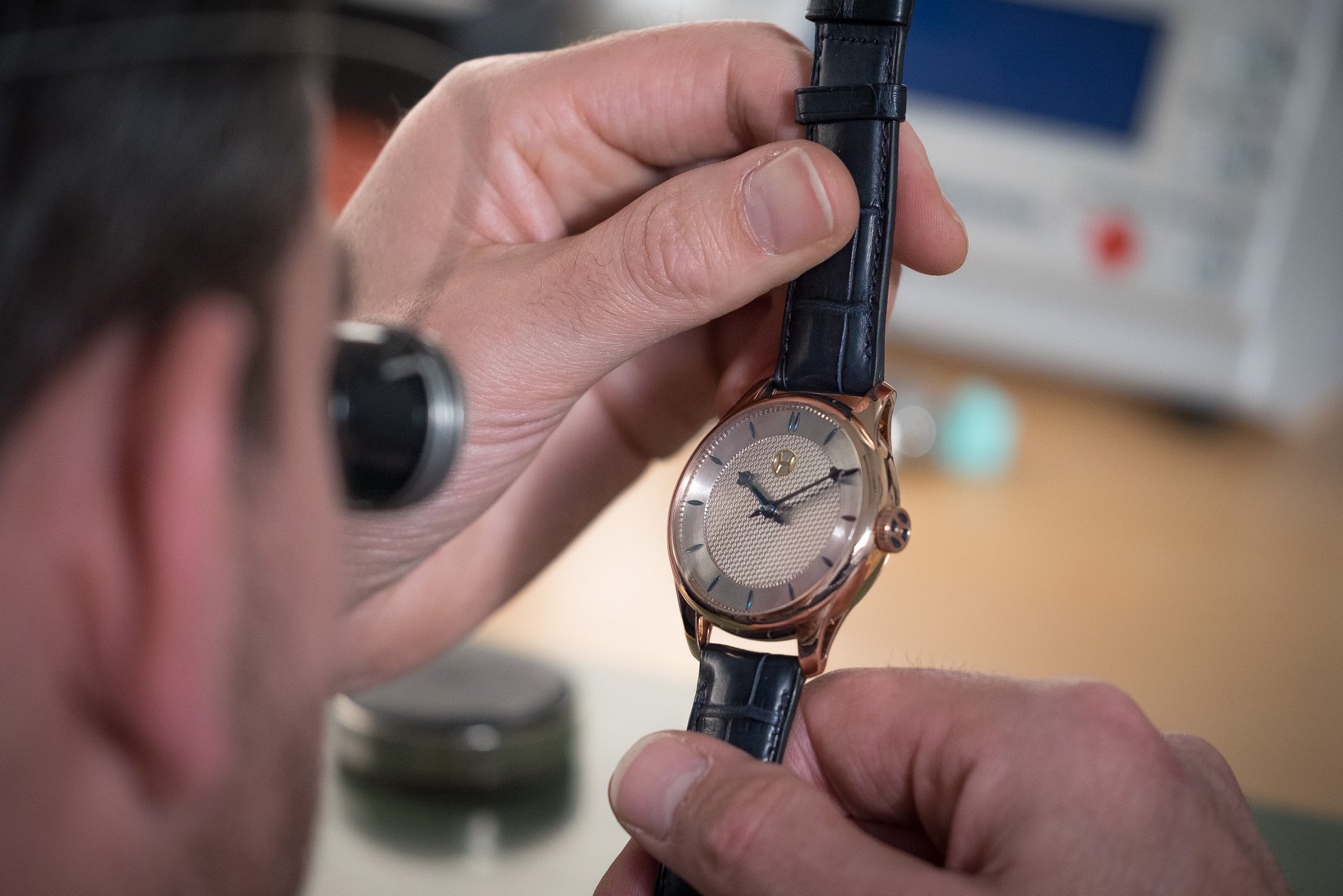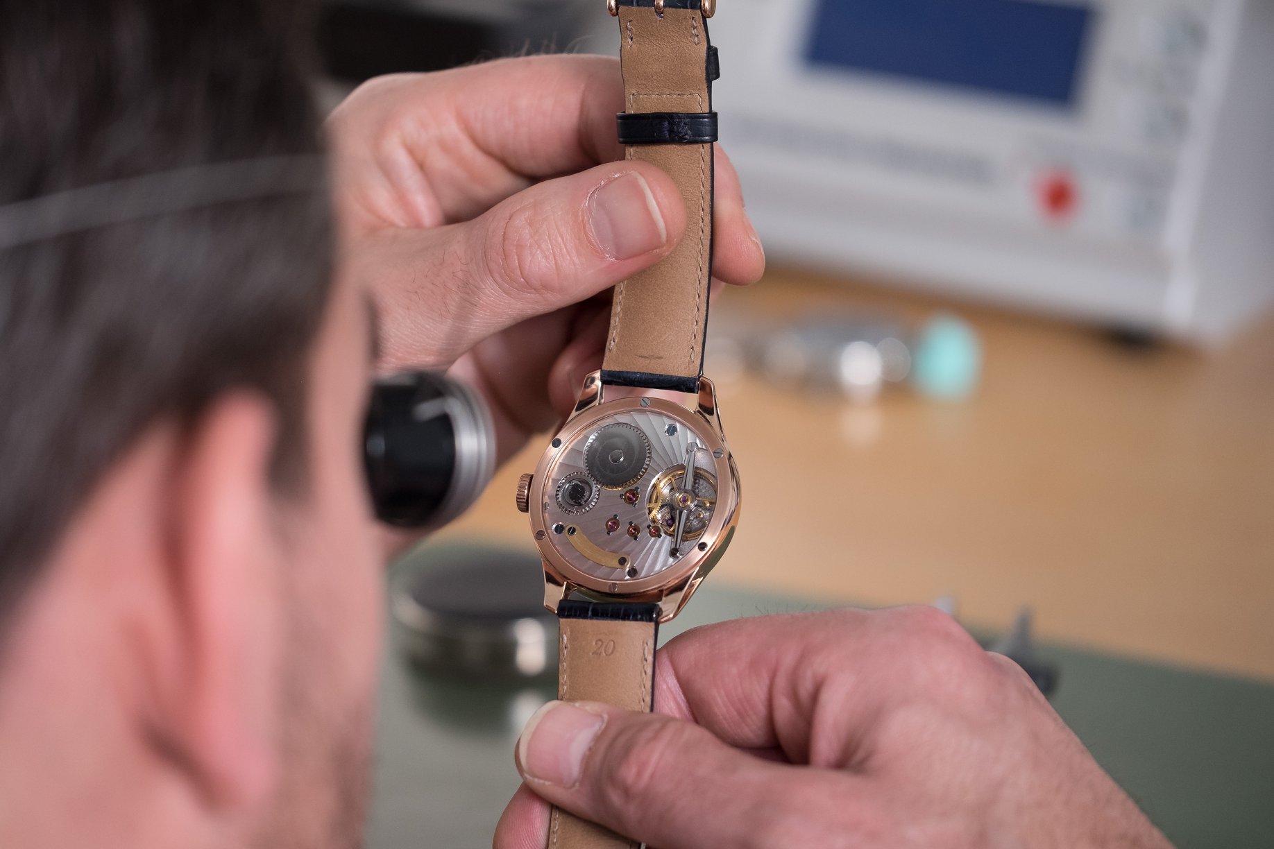- Movement In-house development, manual winding