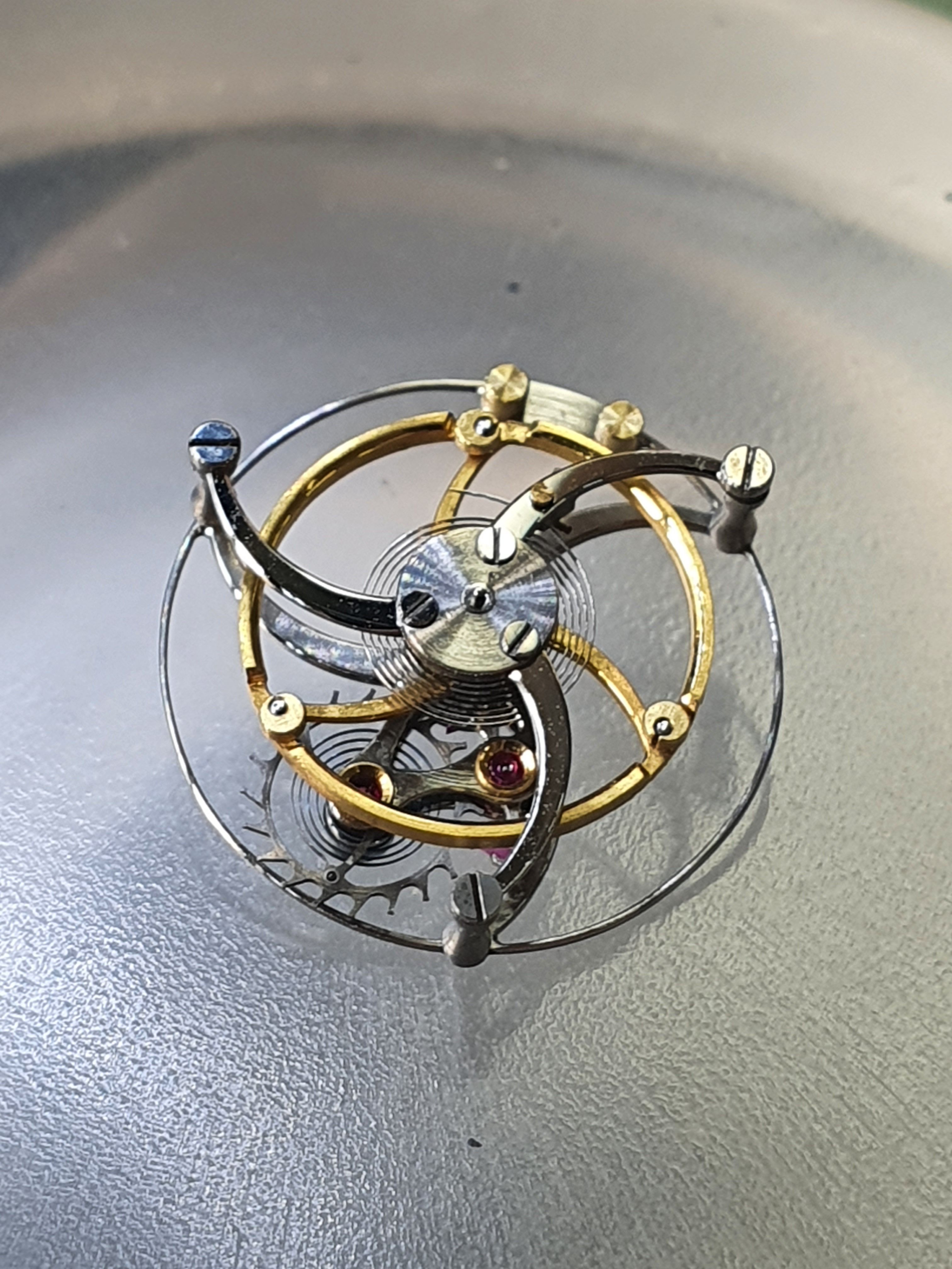 The timepiece features a spring driven escape wheel (for direct impulse to pallets and shock absorbance of the big tourbillon cage), my own invention.